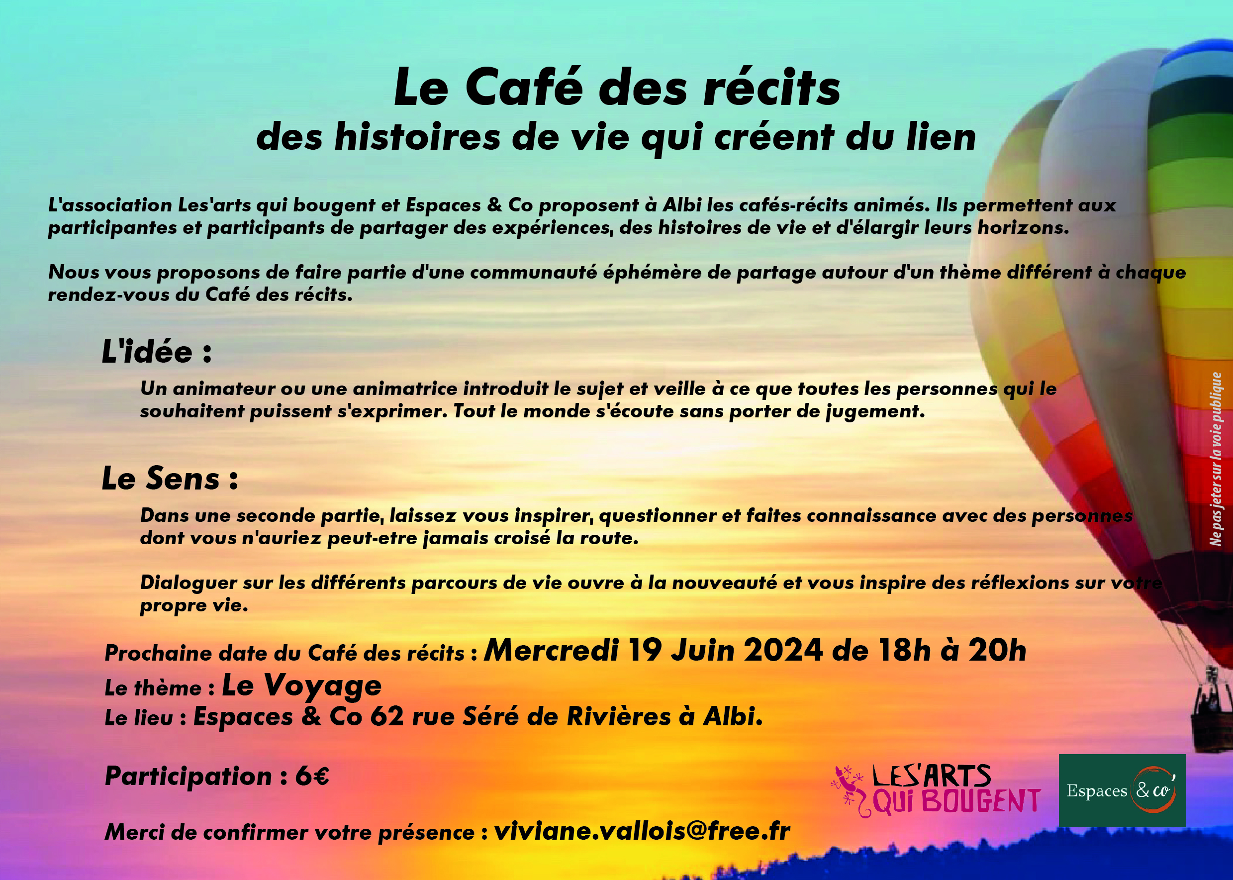 Consacré au thème du voyage (proche ou lointain, imaginaire, intérieur ….) notre dernier rendez-vous du Café des récits de la saison se déroulera le mercredi 19 juin de 18h à 20h chez Espaces & co (62 rue Séré de Rivières à Albi).