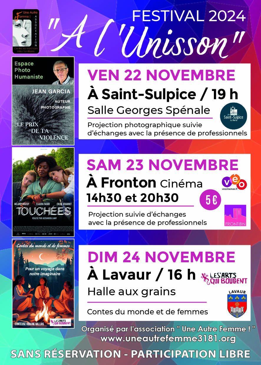 « A l’occasion de la 25ième année de la journée Internationale pour l élimination des violences faites aux femmes, l’association « Une Autre Femme! » vous invite au Festival « A l’Unisson » les 22, 23 et 24 novembre sur les communes de Fronton, Lavaur et Saint Sulpice la pointe. Ce sera pour nous l occasion de sensibiliser le grand public aux violences conjugales et intrafamiliales, de faire évoluer les mentalités et de permettre aux victimes d oser parler ».
